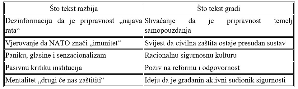 Analiza skloništa u Hrvatskoj dodatno potiče javnost na kritičko promišljanje, ali ne u svrhu zastrašivanja, već u svrhu institucionalnog poboljšanja. Umjesto pasivnog nezadovoljstva, tekst sugerira potrebu za modernizacijom propisa, definiranjem odgovornosti i planovima aktivacije. Time se građane uči da kritičko mišljenje nije isto što i širenje negativnog sentimenta – ono je početak reforme i gradnje funkcionalnog sustava. Posebno je važan segment o percepciji prijetnje. Autor jasno razdvaja stvarnu ugrozu od medijskog dojma ugroze. Poruke iz Bruxellesa nisu poziv na strah, nego poruka da sigurnost ne smije biti prepuštena improvizaciji. Time se čitatelju nudi ključna lekcija: sigurnosna kultura nije reakcija na opasnost – nego prevencija prije opasnosti. Ovakav pristup izravno suzbija dezinformacijske narative koji prevode svaki oblik pripreme u znak nadolazeće katastrofe.