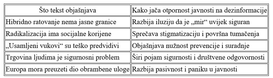 Izuzetno važna edukativna vrijednost nalazi se u prikazu trgovine ljudima kao hibridnog kriminala, koji ne poznaje granice ni ideološku boju. Ovim pristupom građani uče da sigurnost nije samo vojsko-sigurnosno pitanje, nego pitanje ljudskih prava, socijalne podrške i regionalne suradnje. U završnim dijelovima teksta otvara se pitanje europske obrambene autonomije. Objašnjava se da Europa mora preuzeti odgovornost i ne može ostati ovisna o američkim odlukama. Time se ruši dezinformacijski narativ koji promiče dva ekstrema: