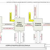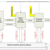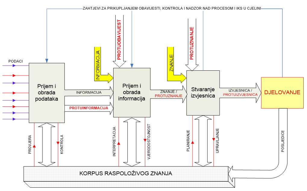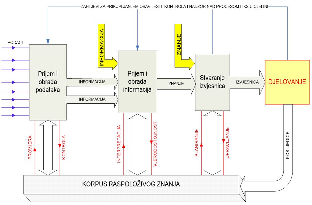 Na slici 2 prikazan je proces kojim se vanjske ulazne vrijednosti korištenjem tehničko-tehnoloških pomagala te ljudskog znanja, pretvaraju u izvjesnice (intelligence) te postaju temelj za donošenje odluka. Ovako prikazan proces ukazuje na svu složenost i međusobnu ovisnost unutarnjih poveznica sustava čija učinkovitost ovisi o: