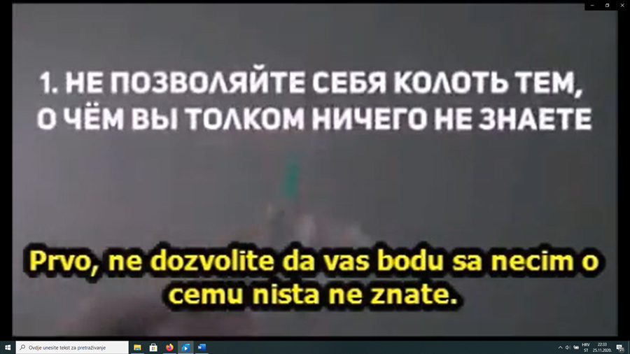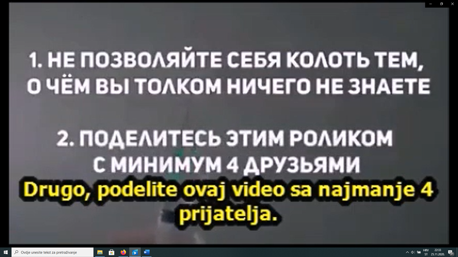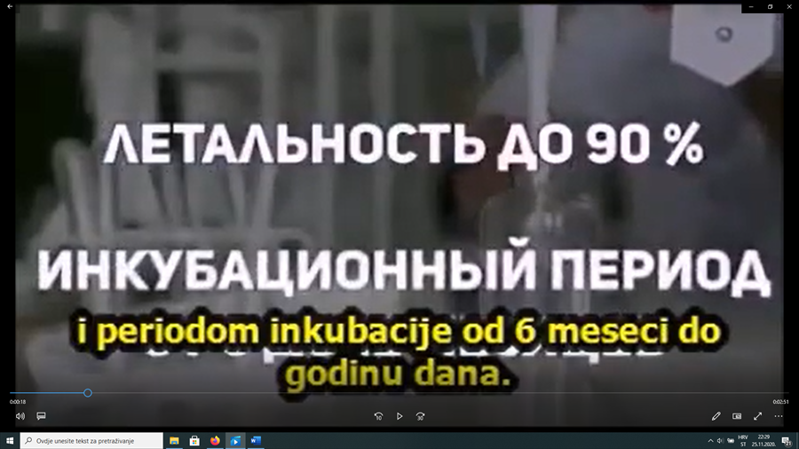 Aplikacijama za komuniciranjem mobilnih platformi (whatsup, viber) brzo se širi video uradak u trajanju od 3 minute i 9 sekundi. Autor videa na tečnom ruskom jeziku govori o „opasnostima“ cijepljenja cjepivom protiv virusa SARS-CoV-2 te upozorava na „zakulisne“ igre kojima je cilj smanjenje broja stanovnika na Zemlji na oko 1 mlrd. Video je titlovan latiničnim pismom pisanim srpskim rječnikom.