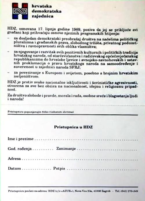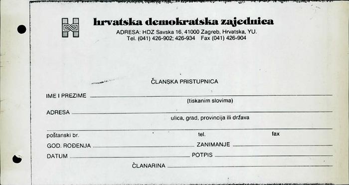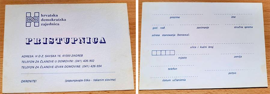 Slika 1. Članska pristupnica HDZ iz 1989./1990.