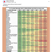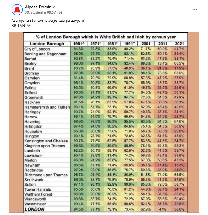 U hrvatskoj javnoj sferi često se šire informacije o teoriji zamjene stanovništva, a iz mnoštva ovdje izdvajamo primjer tablice statističkih podataka objavljena na Facebook stranici, koja prikazuje omjer bijelih Britanaca i Iraca u različitim općinama Londona kroz popise stanovništva tijekom godina. Naslov tablice, stavljen u navodnike, sugerira da teorija zamjene stanovništva nije teorija zavjere.