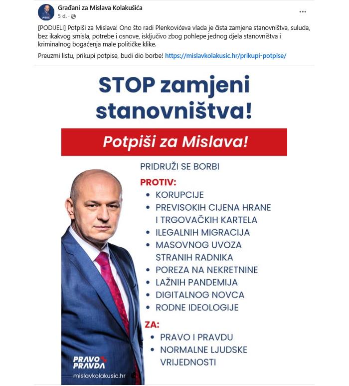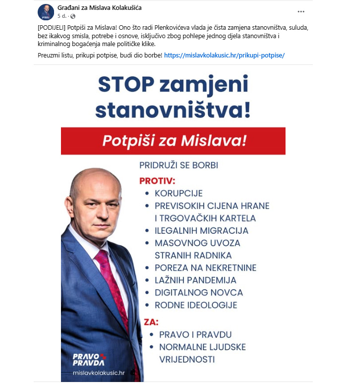 Mislav Kolakušić prikuplja potpise za svoju kandidaturu na predsjedničkim izborima pozivajući građane da kroz podršku njemu stanu na kraj "zamjeni stanovništva".