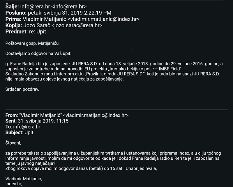 Prilog: Odgovor RERA SD novinaru Matijeviću (istog dana, 31. svibnja 2019.) na pitanje o zapošljavanju Frane Radelje u RERA SD.