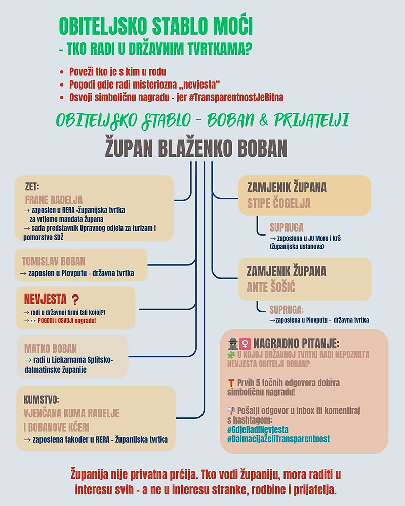Tijekom svibnja 2025. društvenim mrežama i aplikacijama za mobilno komuniciranje dijeli se slika naziva „Župan Blaženko Boban - Obiteljsko stablo moći – Tko radi u državnim tvrtkama“ kojom se pokušava ukazati na moguće brojne slučajeve nepotizma odnosno zlouporabe položaja izabranog župana Splitsko dalmatinske županije Blaženko Bobana. Autor teksta ju je dobio kao Whatsapp poruku. Pretragom interneta, vidljivo je kako se ona distribuirala i na društvenim mrežama: