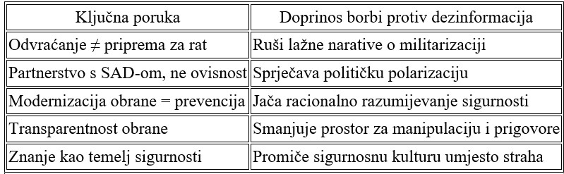 Segment o strateškom komuniciranju također ima veliku edukativnu vrijednost. Autor naglašava da transparentnost i povjerenje nisu javni PR, nego nužni preduvjet uspješne obrambene politike. Kada građani znaju u što država ulaže i zašto, smanjuje se prostor za glasine, optužbe ili teorije zavjere – što predstavlja izravno suzbijanje dezinformacija i informacijske manipulacije. Time se gradi sigurnosna kultura povjerenja, a ne straha.