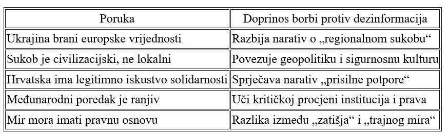 Posebno je važan hrvatski kontekst. Autor podsjeća da Hrvatska ima vlastito iskustvo obrane od agresije. Ovo stvara emocionalni i povijesni most koji objašnjava zašto je hrvatska potpora Ukrajini više od diplomacije — ona je moralna, povijesna i strateška. Time se suzbija dezinformacijski narativ koji pokušava prikazati solidarnost s Ukrajinom kao „nametnuti stav“ ili „posljedicu vanjskog pritiska“. Umjesto toga, potpora se prikazuje kao dijalog iskustava, a ne diktat izvana. Tekst upozorava i na opasnosti „zamrznutog sukoba“. Time se objašnjava da prekid vatre bez jasnog rješenja ne znači mir, nego odgodu novog rata. To je važna poruka javnosti jer se često pojavljuju pojednostavljene tvrdnje da „bilo kakvo smirivanje“ znači uspjeh. Edukativni učinak ovog dijela leži u objašnjenju razlike između taktičkog zatišja i strateškog mira — lekciji koja je ključna za razumijevanje budućih mirovnih procesa.