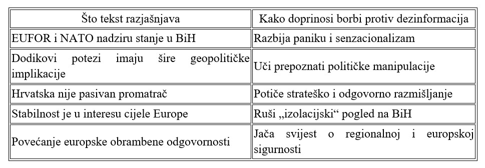 Umjesto toga, autor nudi uravnotežen, faktografski i sigurnosno utemeljen pogled koji građane uči kako procjenjivati regionalne rizike bez panike, ali i bez naivnosti. Prva edukativna vrijednost teksta jest objašnjenje strateške uloge međunarodnih snaga. Naglašavajući prisutnost EUFOR-a i NATO-a, autor pokazuje da se potencijalna eskalacija u BiH nalazi pod aktivnim nadzorom, a ne na rubu rata. Time se razbija senzacionalistički narativ koji se često pojavljuje u medijima. Javnost uči da snažna međunarodna prisutnost djeluje kao instrument odvraćanja – a ne kao znak nadolazeće katastrofe. Ovo je važno za smanjenje širenja glasina, straha i političke manipulacije.