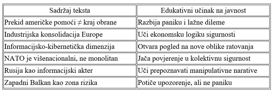 Ovaj tekst ima veliku edukativnu vrijednost jer razbija jedan od najopasnijih dezinformacijskih narativa koji se širi u javnom prostoru: da je „prekid američke pomoći Ukrajini kraj obrane Europe“ ili „početak novog rata u Europi“. Autor umjesto panike nudi razum, stratešku procjenu i konkretne korake koje Europa može poduzeti. Time se gradi otpornost društva – ne samo vojna, nego kognitivna, politička i informacijska.