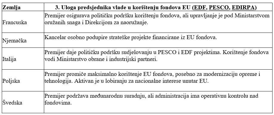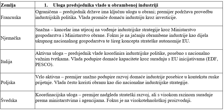 Kako je riječ o različitim strategijama, planovima i provedbenim aktima koji se odnose na gospodarstvo, znanost, istraživanja, sigurnosne i obrambene politike i planove i koji nota bene moraju biti u skladu, s Bijelom knjigom o europskoj obrani – Spremnost 2030., povećanjem izdataka za obranu unutar Pakta o stabilnosti i rastu, sigurnosnim mjerama za Europu (SAFE) putem Instrumenta za jačanje europske obrambene industrije, odluka nije niti mogla biti drugačija. Nacionalna legislativa, (citirane odredbe Ustava RH, te Zakona o obrani) ne daju pravnu podlogu za imenovanje potpredsjednika Vlade i ministra obrane RH za čelnog čovjeka povjerenstva. Stoga je uputno i svrsishodno provjeriti, postoje li tijela sa sličnim nadležnostima i aktivnosti u drugim državama EU/NATO saveza. U svrhu bolje preglednosti donosimo tablični prikaz nekih država prema nekoliko različitih odrednica: